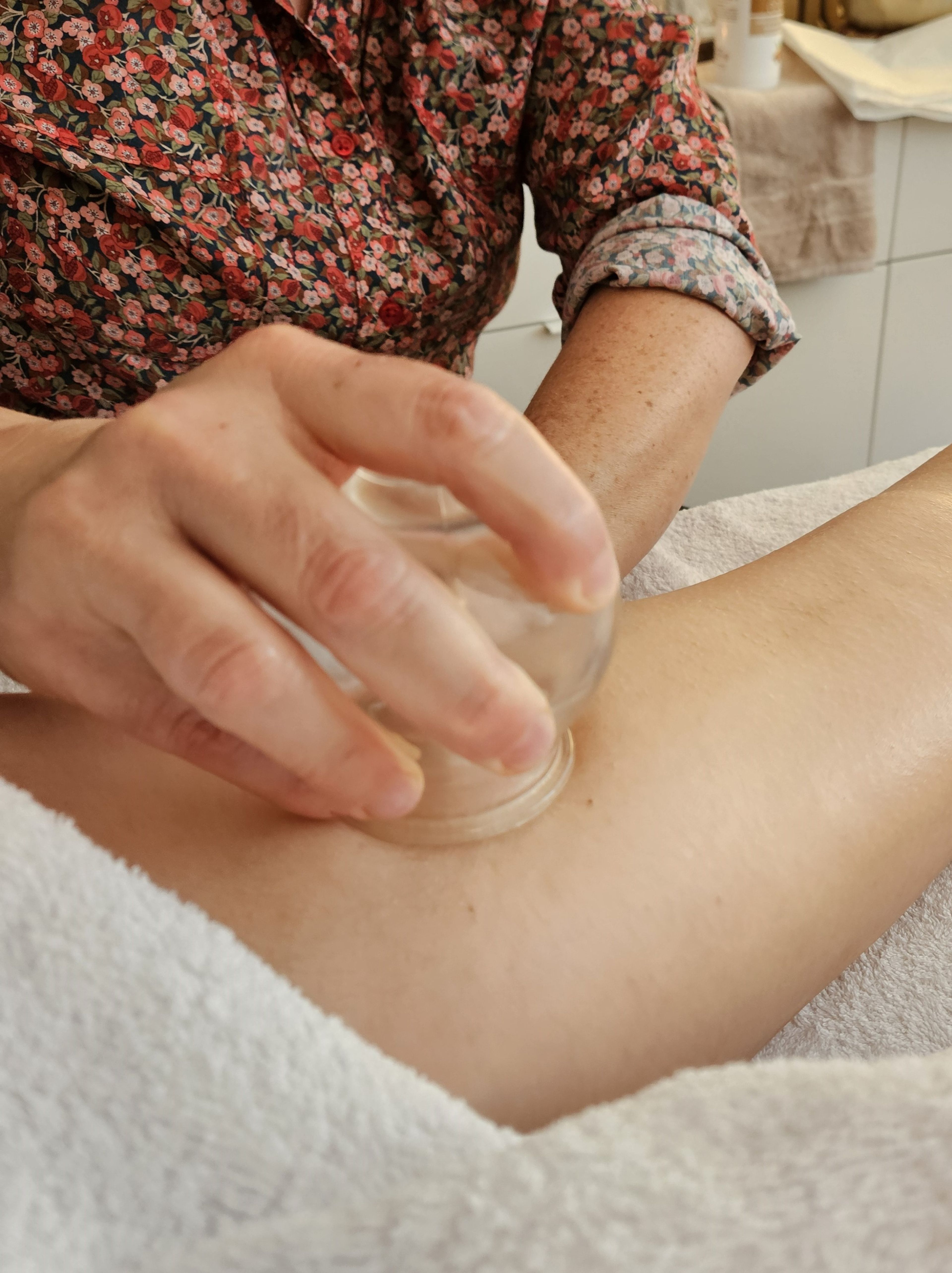 Après un court temps d’accueil, le massage débute par l’activation de points clés, puis se poursuit par des manœuvres profondes et l’usage des ventouses pour cibler les zones de rétention et de congestion.